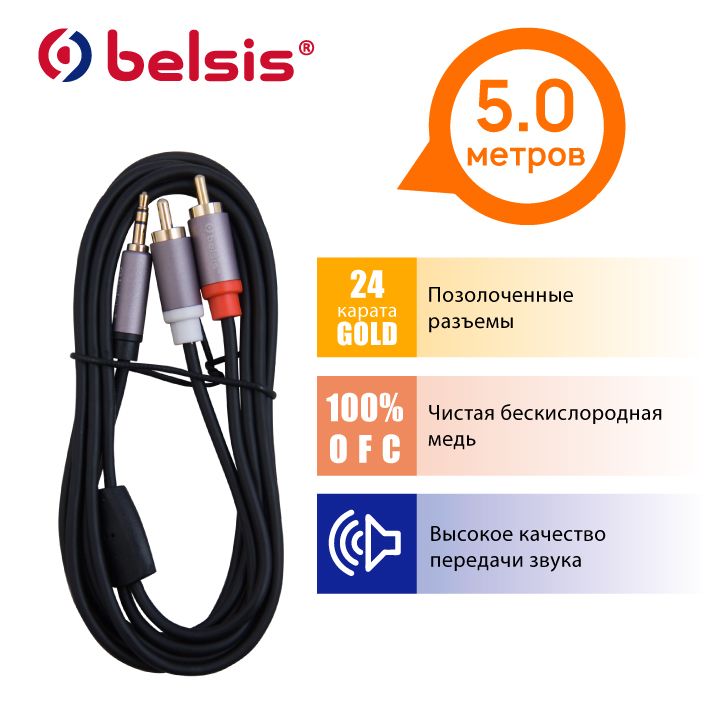 AUX кабель 3,5 мм на 2RCA Belsis Pro, Hi Fi Аудио Стерео, длина 5 метров BW2015