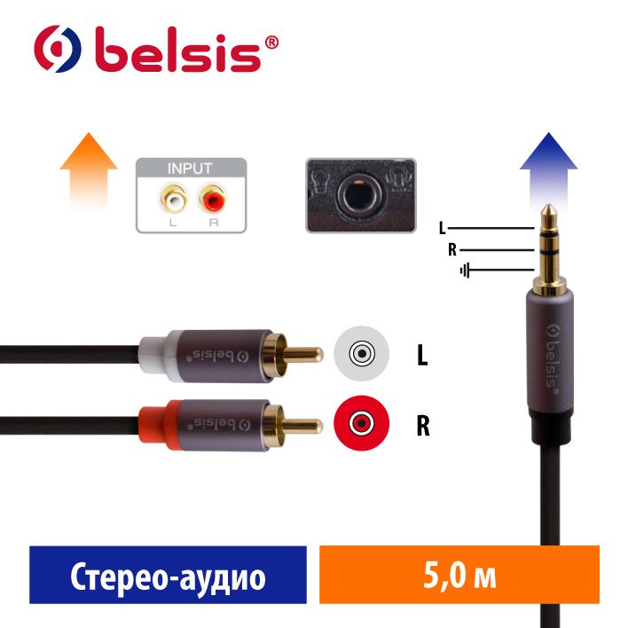 Аукс Стерео аудиокабель кабель адаптер Belsis Pro Jack 3.5mm - 2RCA соединит Ваш iPhone, iPod, устройство потоковой передачи аудио, смартфон, планшет, ноутбук или MP3-плеер с Домашним кинотеатром, AV-ресивером, Микшером, Car Audio усилителем, Автомобильной мультимедийной системой или другим устройством с поддержкой RCA. Шнур имеет классический черный цвет.